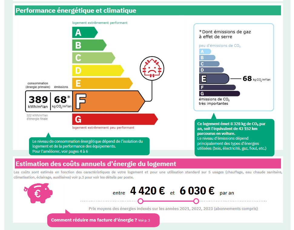 Consommations énergétiques - F - 389 kWh/m²/an.