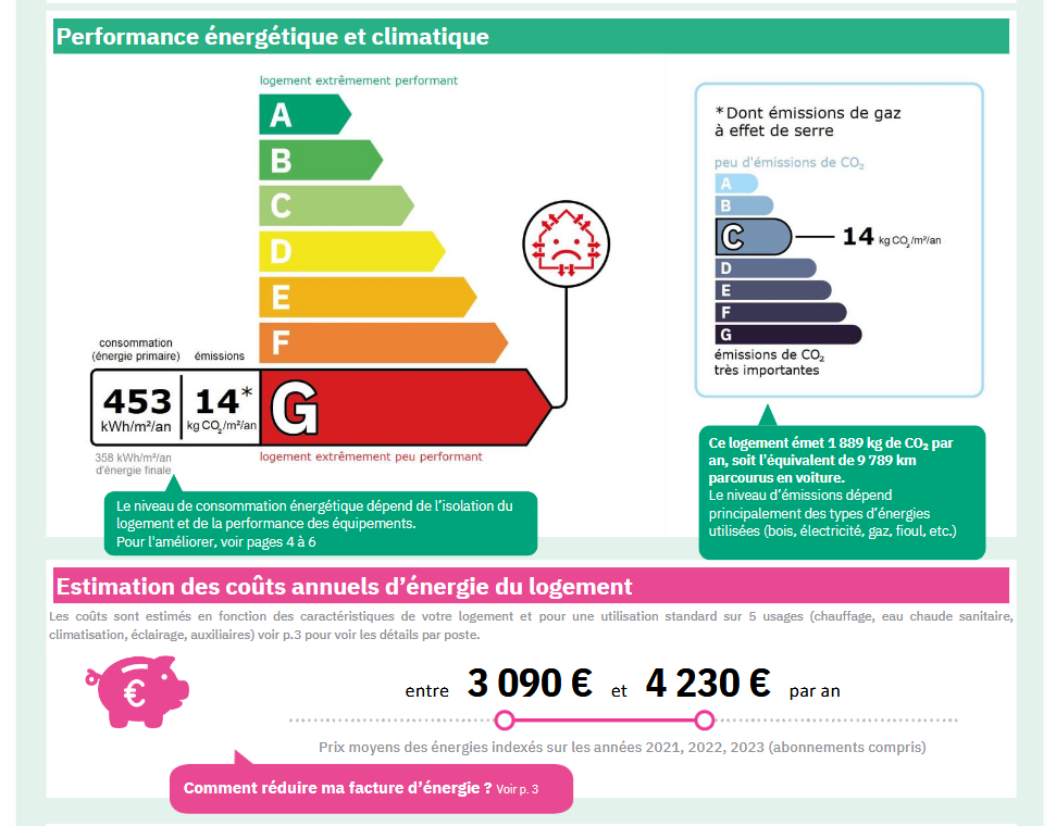 Consommations énergétiques - G - 453 kWh/m²/an.